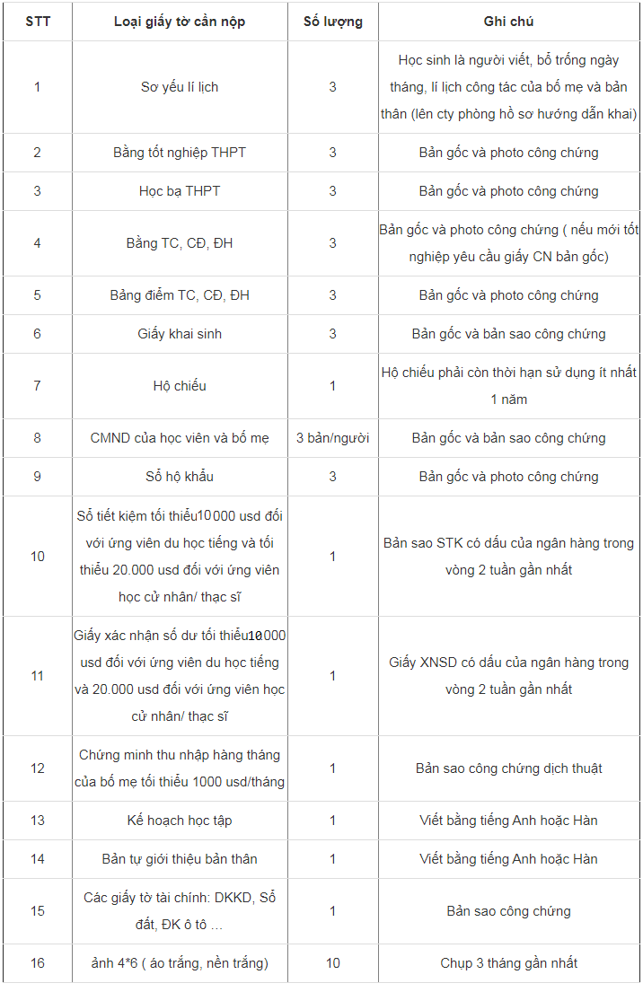 Bạn đang chuẩn bị đi du học Hàn Quốc chăng ? Bạn có nắm được một bộ hồ sơ du học Hàn Quốc cần những giấy tờ gì hay chưa? Đây thật sự là một điều vô cùng quan trọng đấy bạn nhé! Vì vậy, đừng có bỏ qua tìm hiểu về điều này nhé.